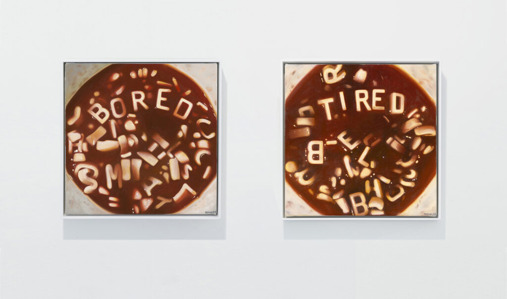 Images: Rainbow, 2024, oil on linen, 55 x 90cm + December 19, 1957, 2024, oil on linen, 56 x 71 + Tired, 2024, oil on linen, 30.5 x 30.5cm + Bored, 2024, oil on linen, 30.5 x 30.5cm